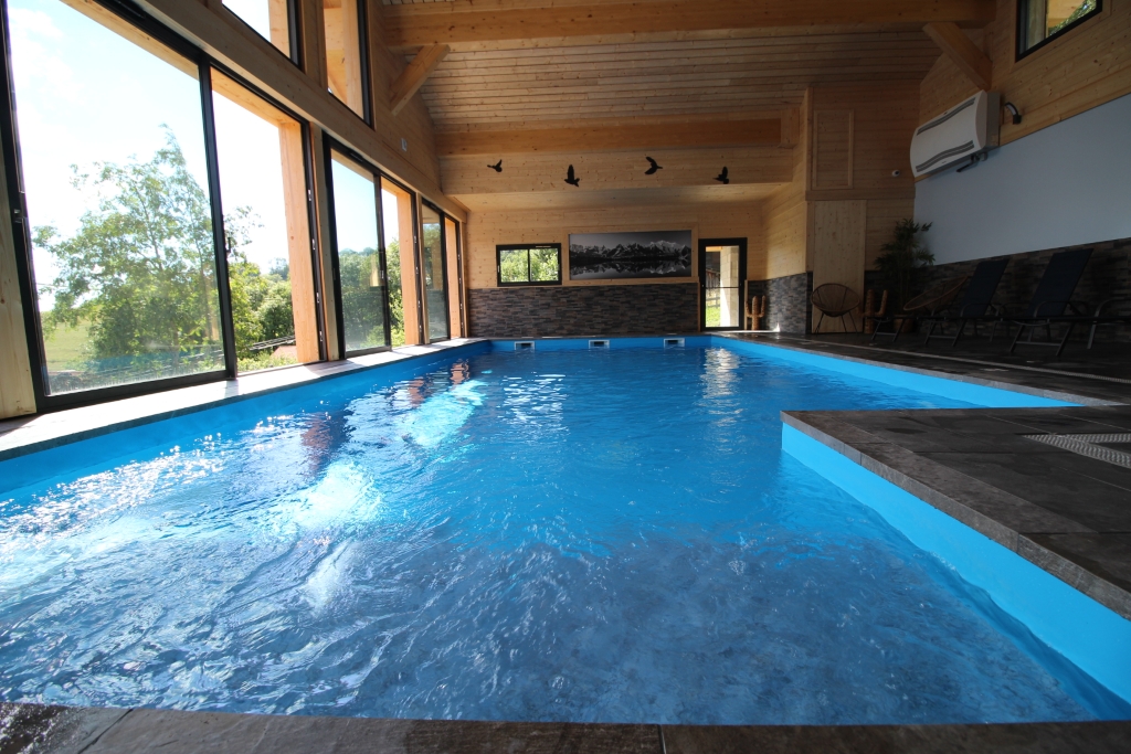 Chalet de montagne avec piscine couverte et chauffée 29,5 °C pour le plaisir des grands et des petits et sécurisé par une porte d’accès avec code ; entièrement privatisé pour vous.